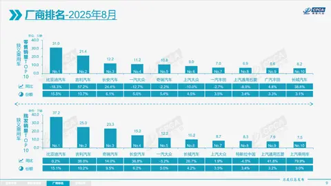 合资品牌方面,8月南北大众均呈现同比下滑态势。一汽-大众同比下滑12.7%,销量为11.2万辆,排名第四;上汽大众同比下滑10.0%,销量9.0万辆,排名第六。日系合资车企中,仅一汽丰田和广汽丰田上榜,分别排名第七和第九,其中一汽丰田同比下滑2.7%至7.0万辆,广汽丰田则同比增长4.8%至6.6万辆,而东风日产、广汽本田、东风本田均跌出榜单前十。此外,上汽通用五菱8月排名第八,销量同比下滑8.0%至6.9万辆。