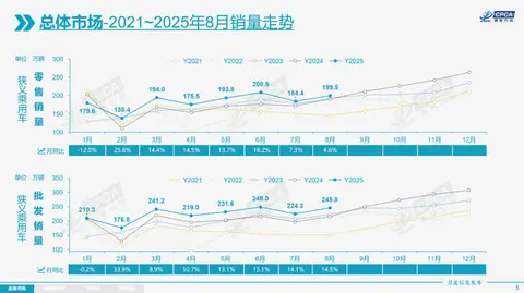 9月8日,乘联分会发布了2025年8月乘用车市场分析。数据显示,当月全国乘用车市场零售销量达199.5万辆,同比增长4.6%,环比增长8.2%。1至8月,累计零售销量为1474.1万辆,同比增长9.5%。新能源乘用车市场表现更为突出,8月零售110.1万辆,同比增长7.5%,环比增长11.6%,前8个月累计零售755.6万辆,同比大增25.8%。