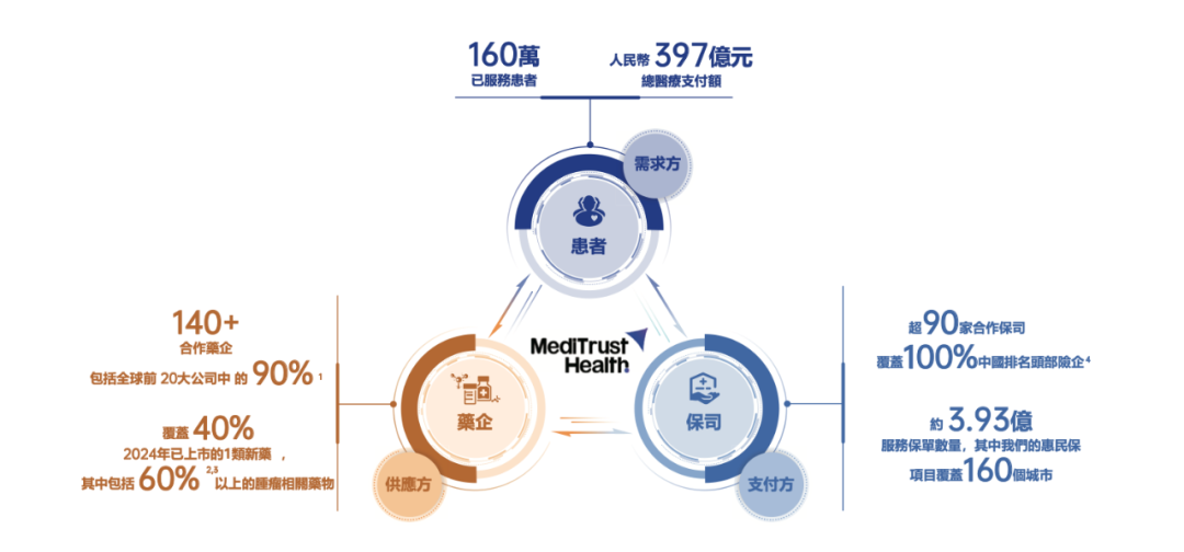 截至2024年12月31日,镁信健康已经累计服务了约160万名患者,有关的医疗支出GPV为397亿元;超过90家保司,包括按2024年保费收入计算中国全部前20大保司;以及超140家药企,包括按2024年收入计算全球前20大公司中的90%。2024年,镁信健康覆盖了40%中国已上市的1类新药,其中包括60%以上的肿瘤相关药物(不计中成药、诊断试剂、疫苗及血液制品)。